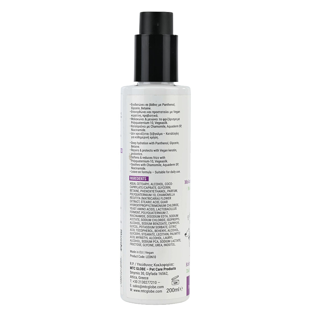 Με φυτικά εκχυλίσματα, προβιοτικά και vegan κερατίνη, προστατεύει και ενδυναμώνει το τρίχωμα, ενώ το χαμομήλι, η νιασιναμίδη και το Aquaderm SP καταπραΰνουν την επιδερμίδα. Δεν περιέχει σιλικόνες ή βαριά λιπαντικά και είναι κατάλληλη για όλους τους τύπους τριχώματος.